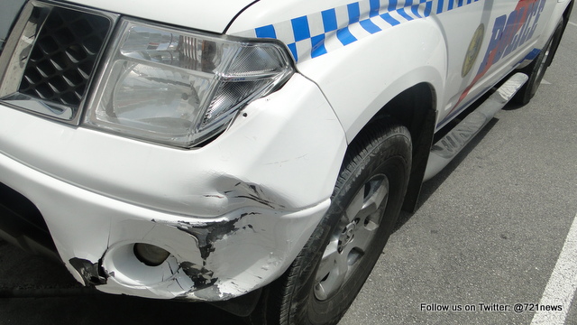 A police patrol located the suspect vehicle in which was driving on the Link One road in the direction of Philipsburg. The patrol chased the vehicle down and forced the driver to stop at the entrance of Fort Willem in the vicinity of Great Bay Hotel. The driver refused to stop the vehicle and in his attempt to get away slammed into the police vehicle causing quite some damage to the left fender and bumper. (See pic of damage police vehicle).