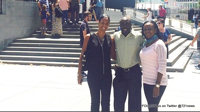 PHOTO CUTLINE: L to R, Andrea Ortega-Oudhoff, Terrance Babtiste and Makini Hickinson in front of the United Nations Building in New York City.
