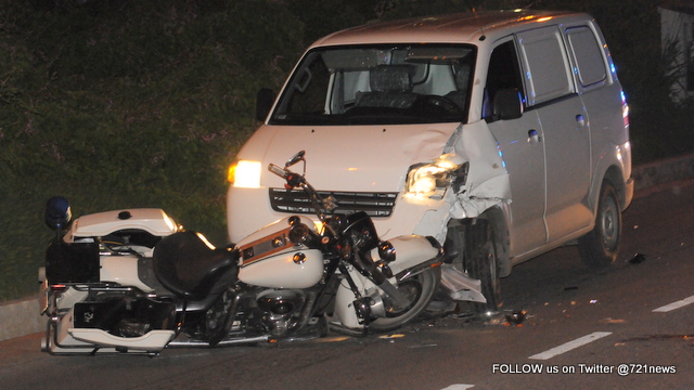 The police traffic department is presently investigating a serious head-on collision involving a motorcycle police officer and a small van driven by another police officer.