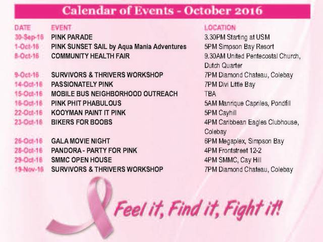 Collective Prevention Services (CPS), a department from the Sint Maarten Ministry of Public Health, Social Development and Labour, commends various organizations and institutions that have established campaigns to create awareness about Breast Cancer.  In various countries around the world October is also recognized as Breast Cancer Awareness Month.