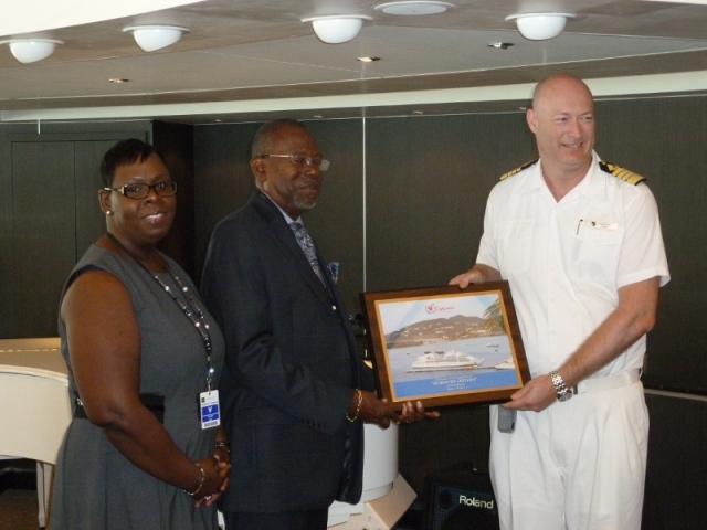 On Saturday, March 11 Seabourn Odyssey Captain Stig Betten was welcomed to Sint Maarten by Port St. Maarten Management representative Hector Peters.  Peters thanked Seabourn for its continued interests in Sint Maarten on behalf of the Government and Port Management.  Peters added that the destination now offered a state-of-the-art homeporting facility and he looked forward to them possibly returning in the future.