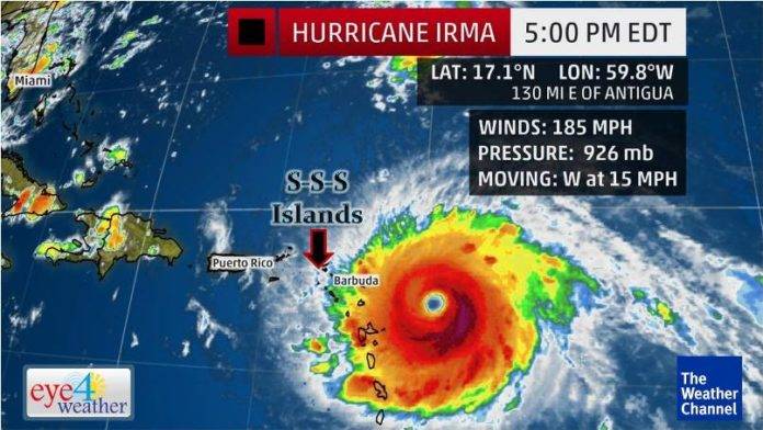 Maximum sustained winds are near 185 mph (295 km/h) with higher gusts – an extremely dangerous category 5 hurricane on the Saffir-Simpson Hurricane Wind Scale. Some fluctuations in intensity are likely during the next day or two, but Irma is forecast to remain a powerful category 4 or 5 hurricane during the next couple of days. Hurricane-force winds extend outward up to 60 miles (95 km) from the center and tropical-storm-force winds extend outward up to 175 miles (280 km). The estimated minimum central pressure is 926 mb (27.35 inches).