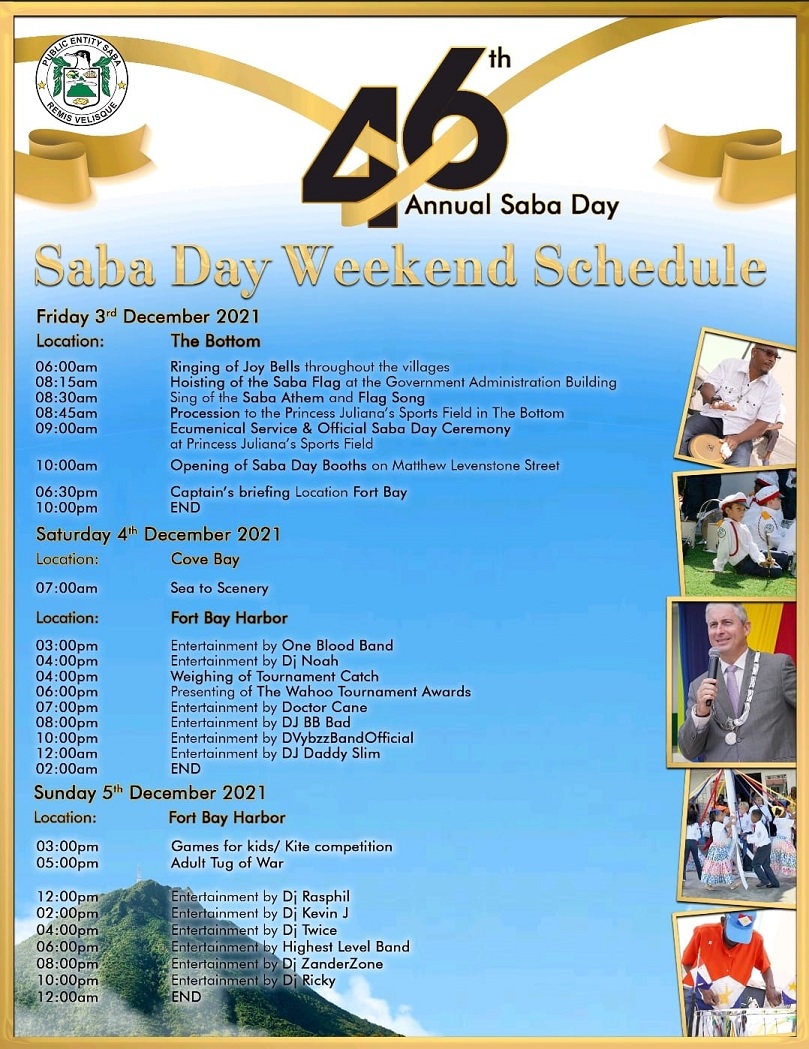 Saba Day on December 3 starts at 6:00am with the ringing of the bells throughout the villages, followed by the hoisting of the flag at the Government Administration Building at 8:15am and the singing of the Saba anthem and the Flag Song. Invited guests and the public will then walk in a procession to the Princess Juliana Sports Field for the ecumenical service and the official Saba Day ceremony. That same morning, the Saba Day booths will open on Matthew Levenstone Street. The famous Saba Day Wahoo Tournament will kick off at midnight.
