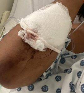 The police were notified and arrived at the scene and started their investigation, while the victim was taken to the Sint Maarten Medical Center, where she underwent surgery because of the multiple stab wounds.