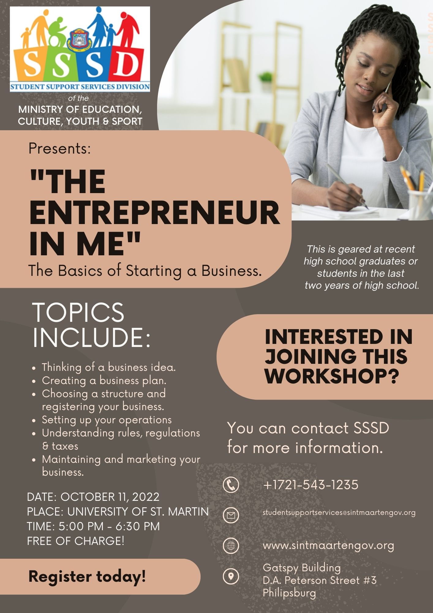 PHILIPSBURG – Many students dream of having their own business and some work diligently to make this dream a reality. Some think that a business is only about making money but it is about much more. Student Support Services Division (SSSD) of the Ministry of Education, Culture, Youth and Sport is once again aiming to educate and inform our youth with its upcoming workshop entitled the “The Entrepreneur in Me: The Basics of Starting a Business.”