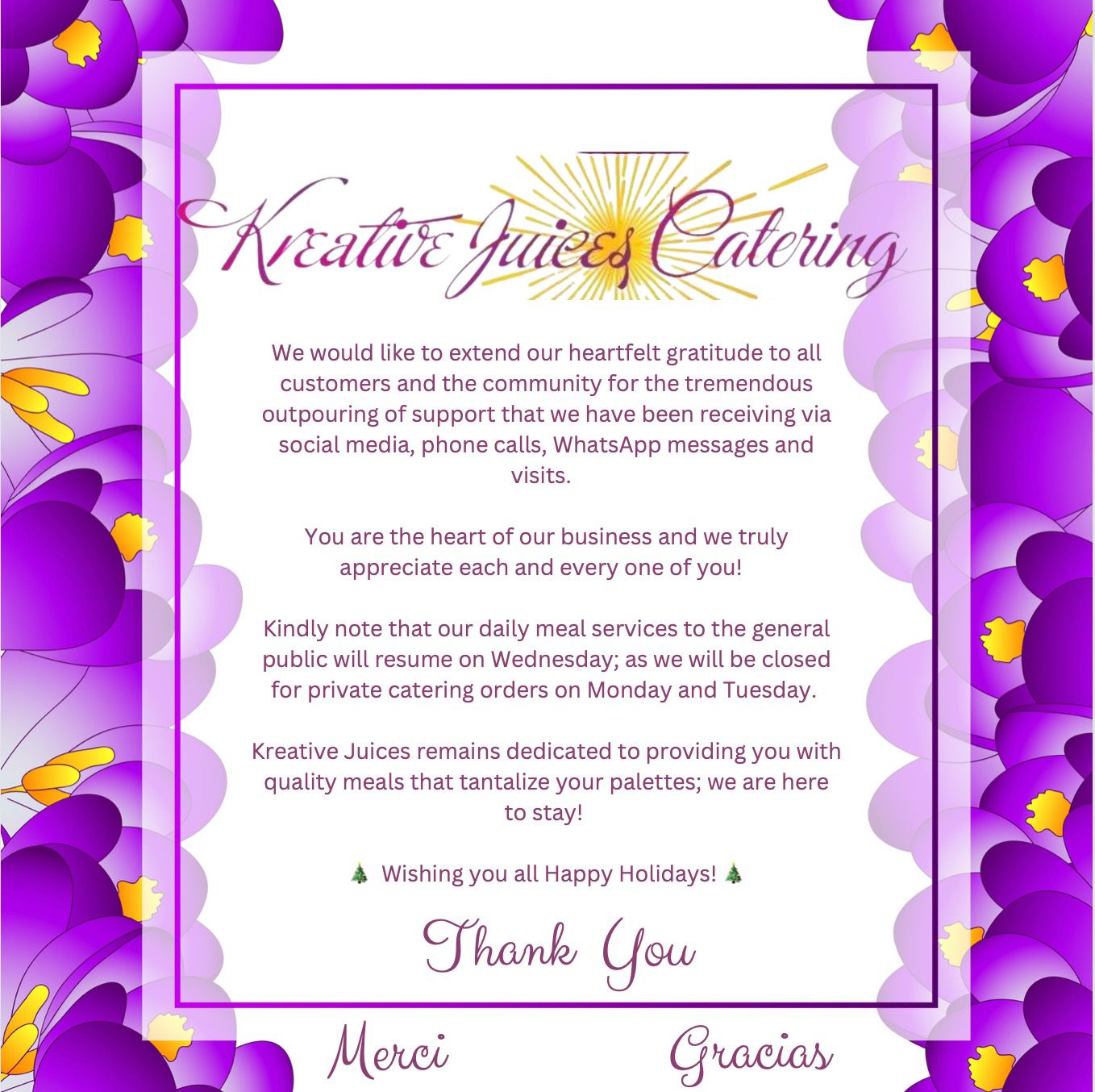 First and foremost, we would like to extend our heartfelt gratitude to all customers who have experienced the Kreative Juices meal services over the years.