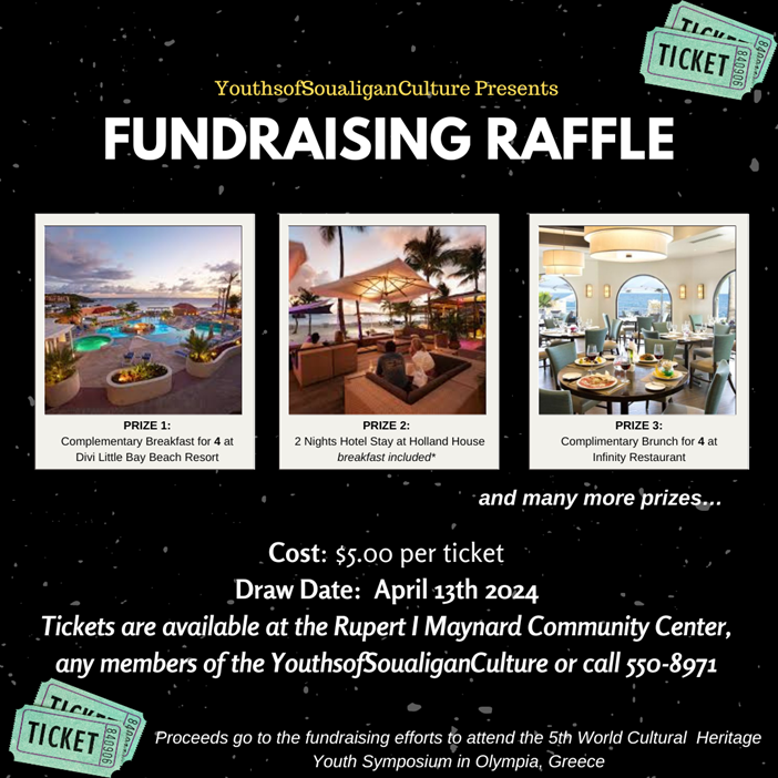 To purchase tickets you can reach out to any member of YouthsofSoualiganCulture, visit the Rupert I Maynard Community Center in St. Peters (next to the basketball court), or contact +17215508971. Thank you for supporting the youth of Soualiga!