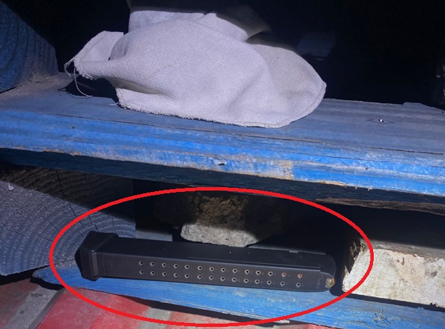 Further observation led the officer to discover an extended firearm magazine containing three rounds of ammunition that was placed in between a wooden pallet in the area by the suspect in question. The suspect, identified by the initials J.R.L. (22), was immediately apprehended.