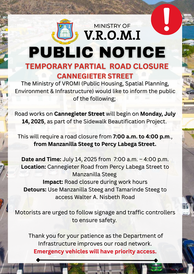 PHILIPSBURG, Sint Maarten — The Ministry of Public Housing, Spatial Planning, Environment, and Infrastructure (VROMI) informs the general public that as part of the ongoing Sidewalk Beautification Project, road works will commence on a section of Cannegieter Road starting Monday, July 14, 2025.