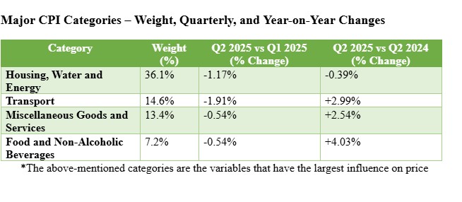 - Transport experienced the most notable drop (-1.91%), mainly influenced by a decline in fuel prices after the Q1 peak travel period.