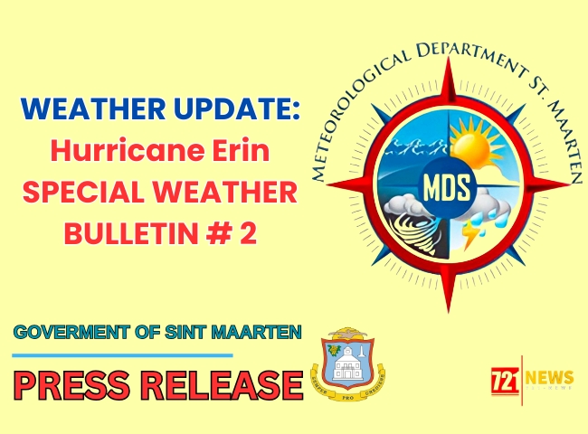 At 11pm the center of tropical storm Erin was located near latitude 17.1 North, longitude 52.7 West or about 690 miles east-southeast of St. Maarten.