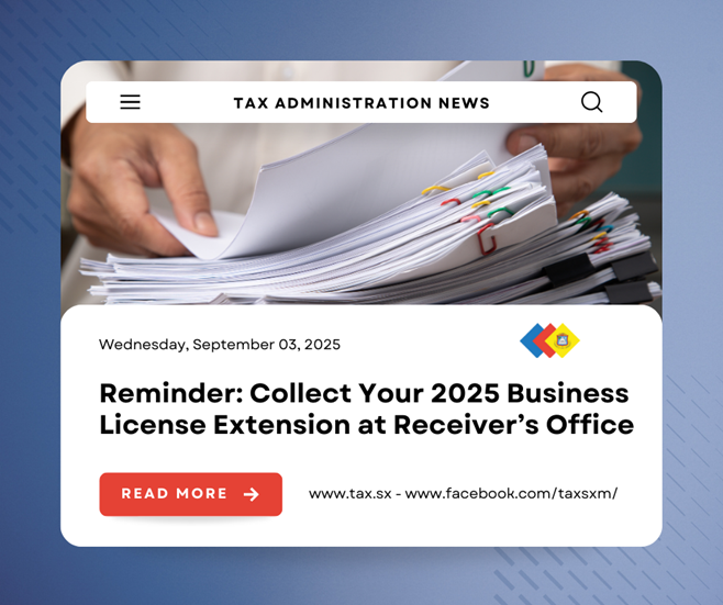 Philipsburg – The Sint Maarten Tax Administration hereby reminds all businesses that have already paid online for their 2025 business license extensions that their documents are now available for collection at the Receiver’s Office on Pond Island.