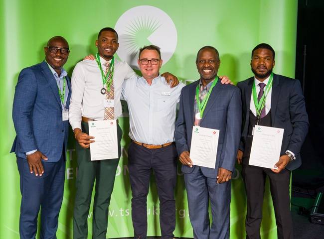 Left to right: Mr. Benjamin Ortega – Managing Director, Kadaster; Mr. Alexander Marlin – Surveyor; Mr. Alan Mansell – Survey School Manager; Mr. Jonathon Charles – Operations Manager; and Mr. Alexander Carty – Surveyor celebrate the completion of the two-year diploma program, recognised by the Royal Institution of Chartered Surveyors (RICS) and The Survey Association (TSA). The programme combines classroom instruction with extensive fieldwork in control surveys, topographic work, setting out, and data management.