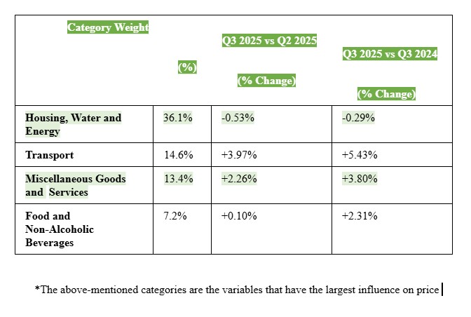 In Q3 2025, the CPI inflation increased by 1.12% compared to the same quarter of 2024. The CPI shows that movements across four (4) key expenditure categories were as follows: