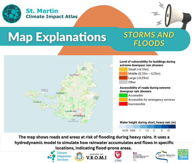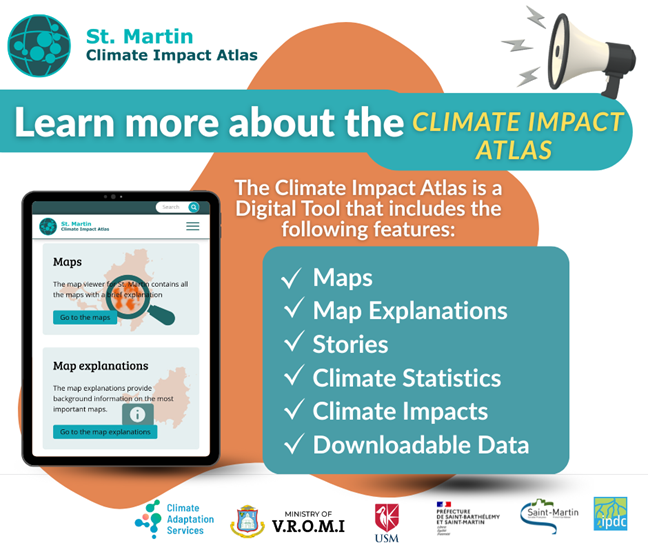 Developed by Climate Adaptation Services (CAS), the Ministry of Public Housing, Spatial Planning, Environment and Infrastructure (VROMI), the University of St. Martin (USM), and a broad network of over 25 local and international partners, the Climate Impact Atlas is a free, digital platform designed to support informed decision-making and climate preparedness across the island.