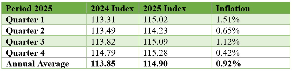 The total average CPI for 2025 is 114.90. The inflation for 2025 is 0.92% indicating that overall price movements remained relatively stable throughout the year.