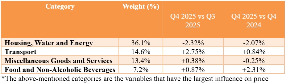 Overall, the CPI for Q4 2025 increased slightly by 0.42% compared to Q4 2024. This modest rise was largely influenced by contrasting movements within the four main expenditure categories. Inflation remained below 1% year-on-year, reflecting stable price developments across most categories.