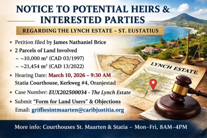 PHILIPSBURG — Residents of St. Maarten who may have an interest in the Lynch Estate in St. Eustatius are hereby informed that a petition has been submitted to the Court of First Instance of Bonaire, St. Eustatius and Saba, sitting in St. Eustatius.
