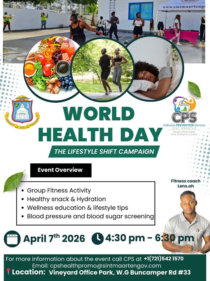 GREAT BAY, Sint Maarten (DCOMM) – The Collective Prevention Service (CPS) is encouraging everyone to participate in its “The Lifestyle Shift Campaign,” that will take place on Tuesday April 7, World Health Day (WHD).CPS: You’re Invited to a World Health Day Activity on April 7