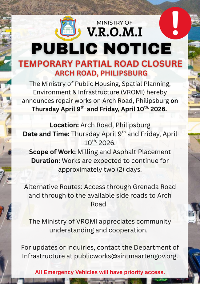 Sint Maarten — April 9th, 2026, Madame Estate – The Ministry of Public Housing, Spatial Planning, Environment, and Infrastructure (VROMI) hereby informs the public and residents of the affected area that road works started today on Arch Road, Philipsburg, Thursday April 9th, 2026 and will continue tomorrow Friday April 10th, 2026. The works will require a road closure between the intersection A.TH. Illidge Road and Guadeloupe Road during the hours of 7:00 a.m. and 4:00 p.m.