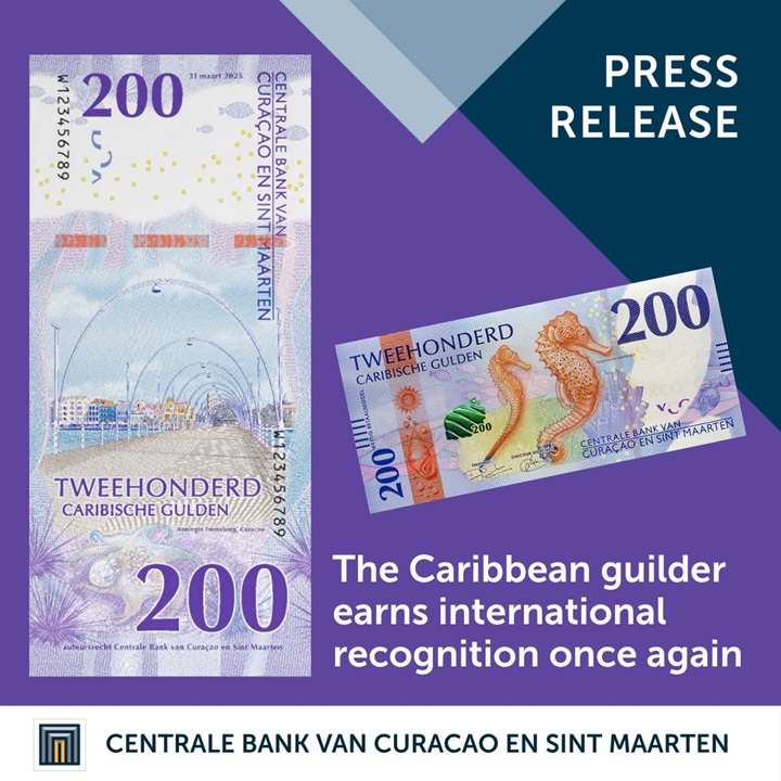 Willemstad/Philipsburg – The Centrale Bank van Curaçao en Sint Maarten (CBCS) announces that the Caribbean guilder has once again received international recognition. The International Bank Note Society (IBNS) has named the 200-guilder banknote “Bank Note of the Year 2025.” This latest honor follows earlier recognition in June 2025, when the CBCS received an award for the Cg banknote series as a whole. In March this year, it was also announced that the CBCS had won the Central Banking Currency Manager Award for the successful introduction of the Caribbean guilder.
